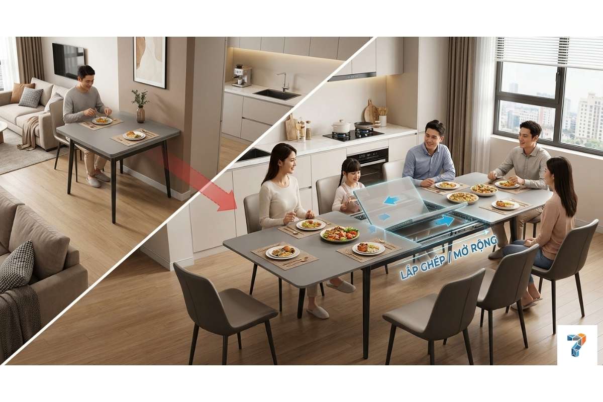 Không phải vì bàn cố định kém — mà vì bối cảnh sống căn hộ hiện đại cần sự linh hoạt mà bàn cố định không cung cấp được.