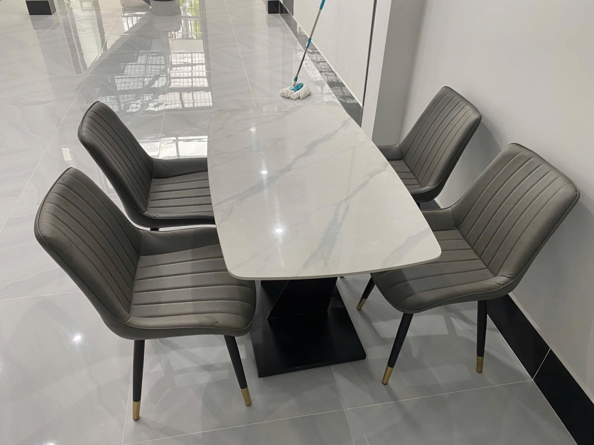 Bàn ăn mặt đá chân chữ V kèm 4 ghế không chỉ phù hợp với không gian phòng ăn rộng mà còn lý tưởng cho những căn hộ có diện tích vừa và nhỏ. Thiết kế tinh giản giúp tiết kiệm không gian nhưng vẫn đảm bảo sự tiện nghi và thoải mái. Với kích thước phù hợp, sản phẩm này dễ dàng bố trí trong nhiều kiểu không gian khác nhau, mang lại sự tiện ích tối đa cho các bữa ăn gia đình.
