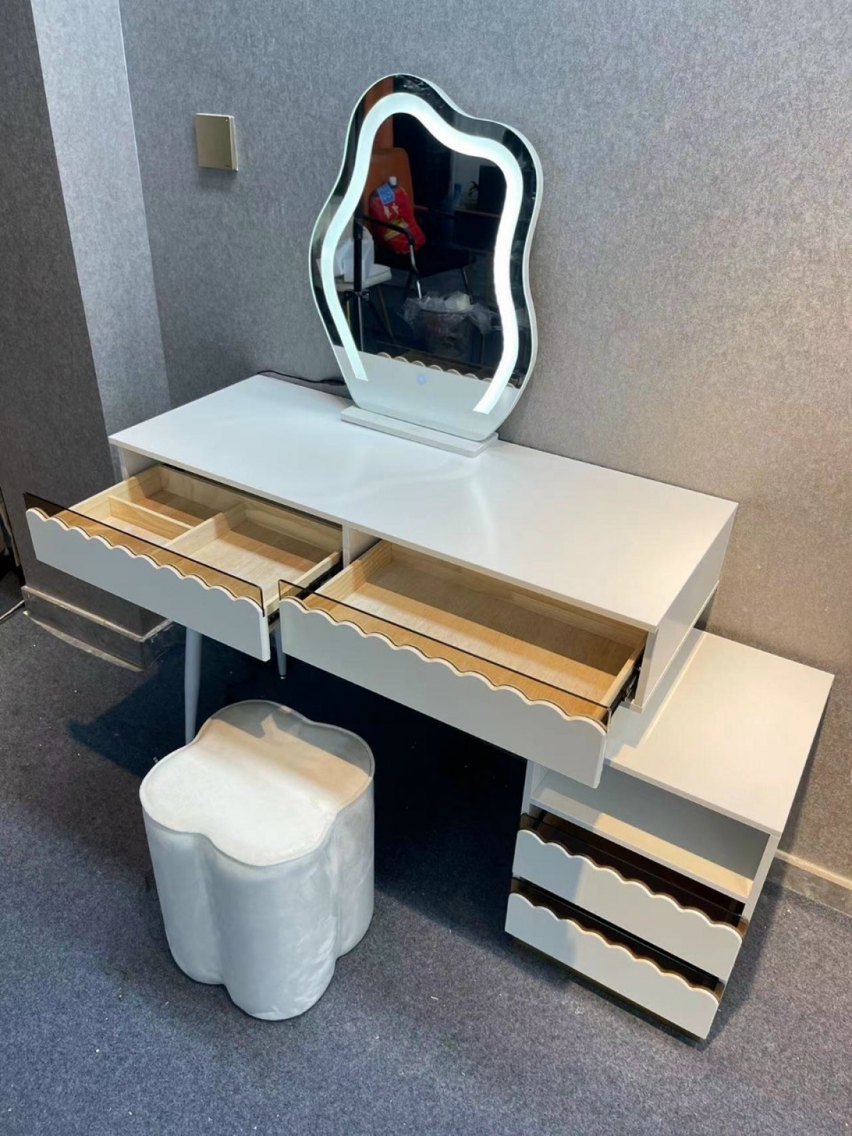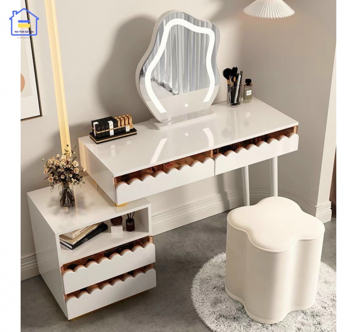 - Ngăn kéo tiện ích: Nhiều ngăn kéo rộng rãi, giúp bạn lưu trữ mỹ phẩm và phụ kiện gọn gàng.